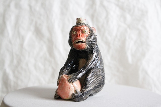 作品サイズ/全高約9.5センチ 幅約4.7センチ 奥行約7センチ 素材/陶 ※ 陶芸作家の相場るい児さんによる猿の陶人形。 2016年の干支に合わせ制作された作品。 相場さんのアトリエで保管されていたもの。 不老長寿の縁起もの、桃を持った猿。 その頭上には白猫が乗り寝っている、という意匠。 相場さんの作品は全て手びねりで制作されています。 型を使わないので制作の時期により同じ意匠のものでも サイズやお顔立ちに個体差が生まれます。 こちらは2015年の秋頃に制作された作品。 次の申年にはまたあらたに猿を制作しますが、 この猿と同じものにはなりません。