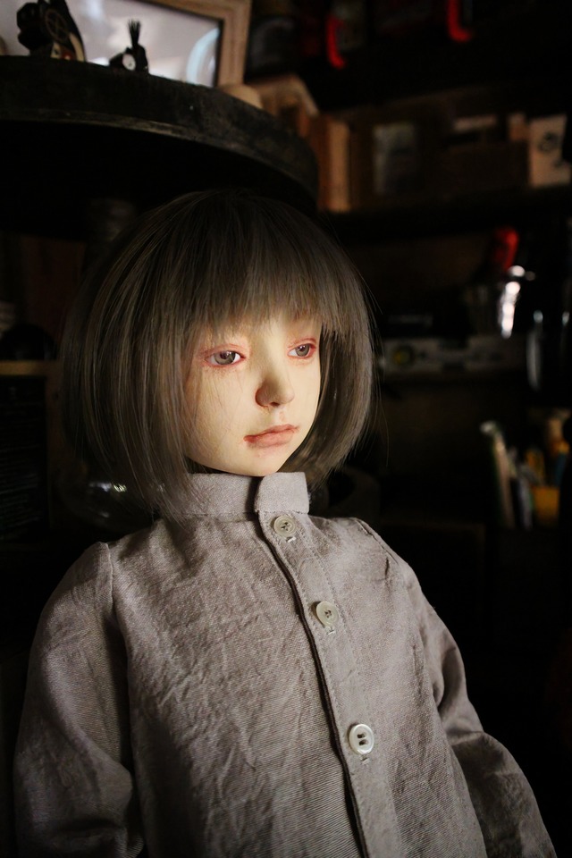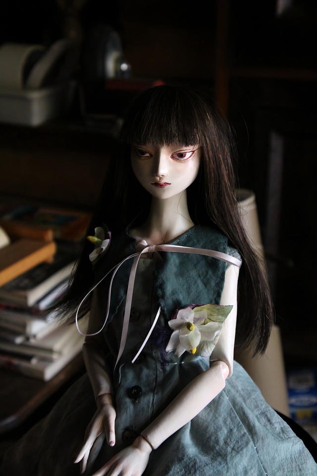 作品サイズ/約55cm 素材/石塑 桐塑 和紙貼り すが糸 グラスアイ ※ 回文も手がける人形作家、江村あるめさんの2025年発表の 少女人形。 夕方の雨、雨の音を聴きながら夜に沈んでいく。 そんな静かな雨のイメージで制作された作品。 制作を進める中、タイトルはなんとなくYから始まるという気がしたとのこと。 江村さんの作品としては珍しい黒髪ロング。 毛先だけ巻いた髪型もめずらしい。 本体は石塑と桐塑の混合粘土。 造形後に和紙を貼り込み彩色。 和紙貼りの前にも下地として色を置き、 和紙を貼ったその上からもさらに色をかけ人の肌の色味を出しています。 関節は首と両肩・両肘・両手首、足の付け根・両膝・足首。 首と足首は独立球。 程よく我の抜けた、たおやかな面差しのひと。 衣装も江村さんが仕立てたもの。 ※ 初出は2025年11月開催の人形展「Eunoia」(東京・品川 ハレルヤ工房)。 人形展「Eunoia」 2025.11.21~11.23 → 11.28~11.30 12:00~19:00 東京品川・ハレルヤ工房 江村あるめ 桐原ユウ 先﨑瑠莉 土谷寛枇 槙宮サイ 平井拘 吉田美和子 主催 平安工房