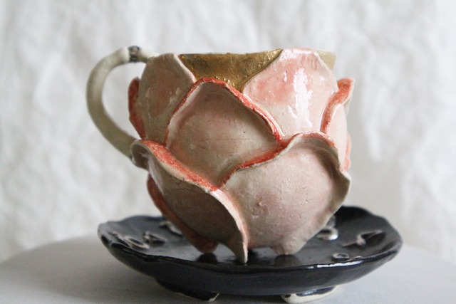 作品サイズ/ カップ本体全高約7cm(ハンドル含) 最大幅約9.5cm(ハンドル含) ソーサー最大幅約11cm 素材/陶 ※ 陶芸作家の相場るい児さんによるカップ&ソーサーのひとつ。 カップは薔薇を、ソーサーは時計を意匠にしている。 ハンドル部分は手。 カップの底には鍵穴がひとつ。 この鍵穴の合鍵は、ソーサーの真ん中に。 ソーサーの数字などは立体的に造形されています。 ソーサーは単体で菓子皿としても楽しめます。 相場さんの作品は型や轆轤を使わず全て手びねりで制作されている為、 意匠が同じでも個体差があり、一点ものとなっています。 ※ こちらの作品は2点在庫があります。