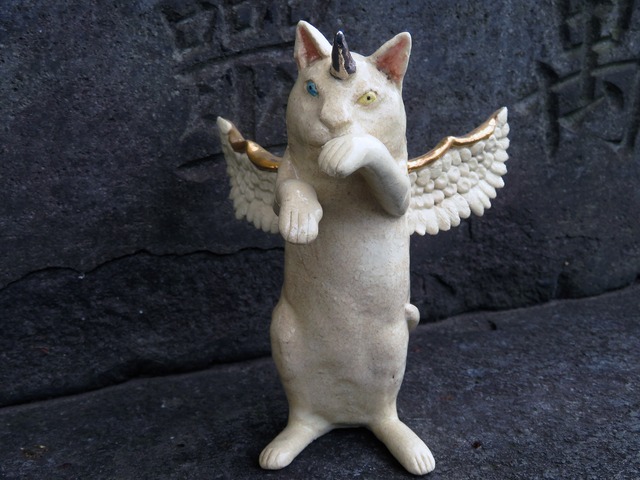 作品サイズ/全高約15㎝(角の先まで) 幅約15㎝(翼の先まで) 奥行約9.5㎝(翼の先まで) 素材/陶 ※ 陶芸作家の相場るい児さんによる2026年の干支作品。 翼と角をもつ架空の馬「アイコーン」に着想を得て制作された、 こちらは「ニャンコーン」です。 翼には金釉、角はプラチナ釉で仕上げられています。 2026年の干支作品はニャンコーンの他、丙午も販売中。 相場さんの作品は全て手びねりで制作されている為、 制作の時期により顔立ち大きさなどが個々に違ってきます。