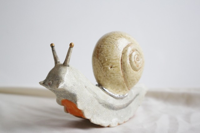 作品サイズ:全高約12cm/幅約3.8cm/奥行約16cm 素材/陶 ※ 陶芸作家の相場るい児さんによる陶のカタツムリ。 指で軽く突くと、ゆらゆらと前後に揺れます。 本作は中世ヨーロッパの写本に頻繁に描かれる蝸牛に材を得て制作されたもの。 そこに郷土玩具のような素朴でおおらかな「動き」の要素を加え、 相場さんならではの感性で再構成。 相場さんの作品はどれも手びねりで制作されている為、 意匠が同じでも個体差があり、全てが一点ものとなっています。
