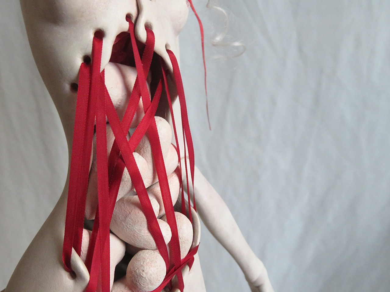 素材/石塑粘土 化繊 リボン 和紙貼り(ハートと胴体の内側)テンペラ仕上げ