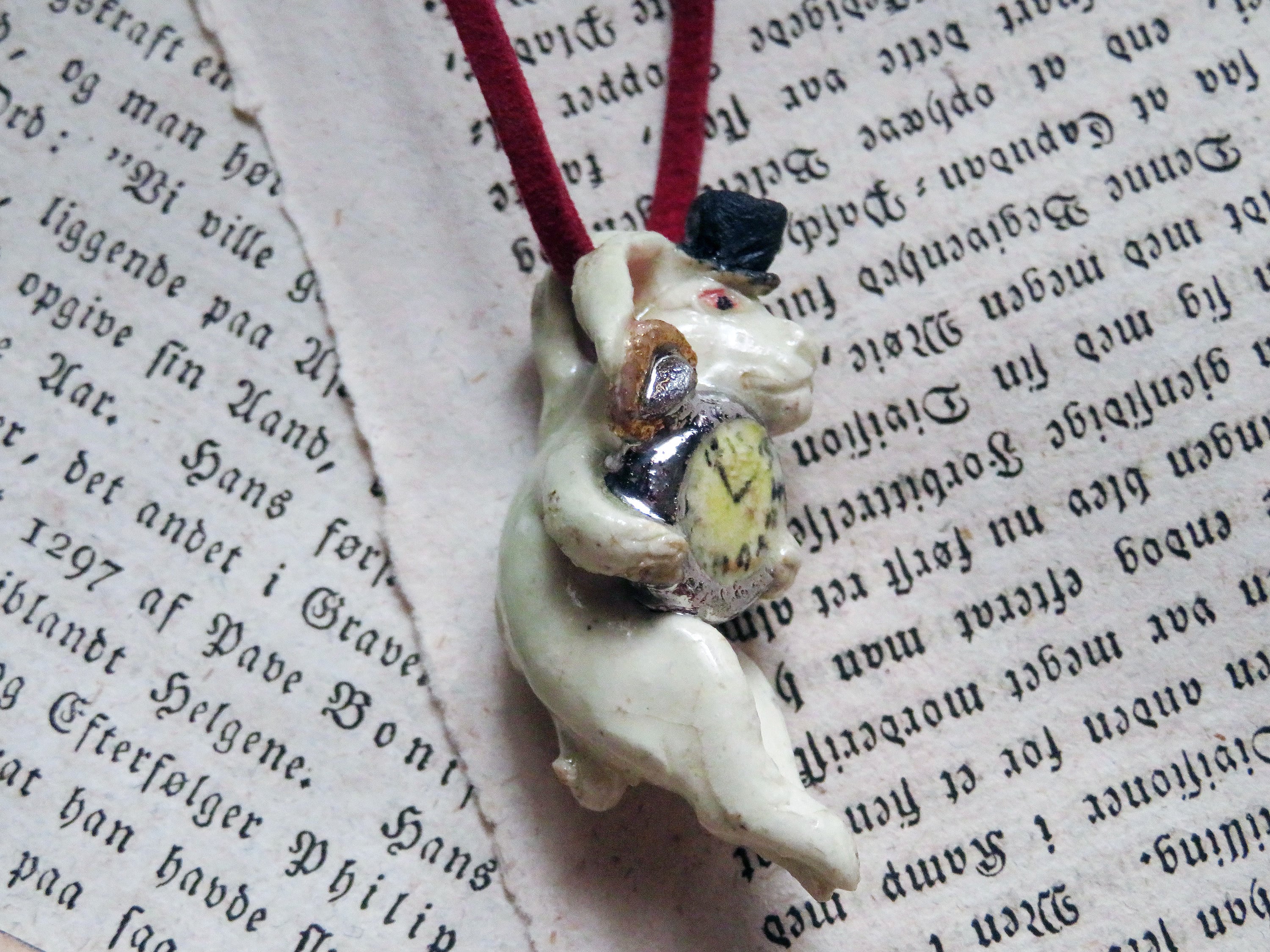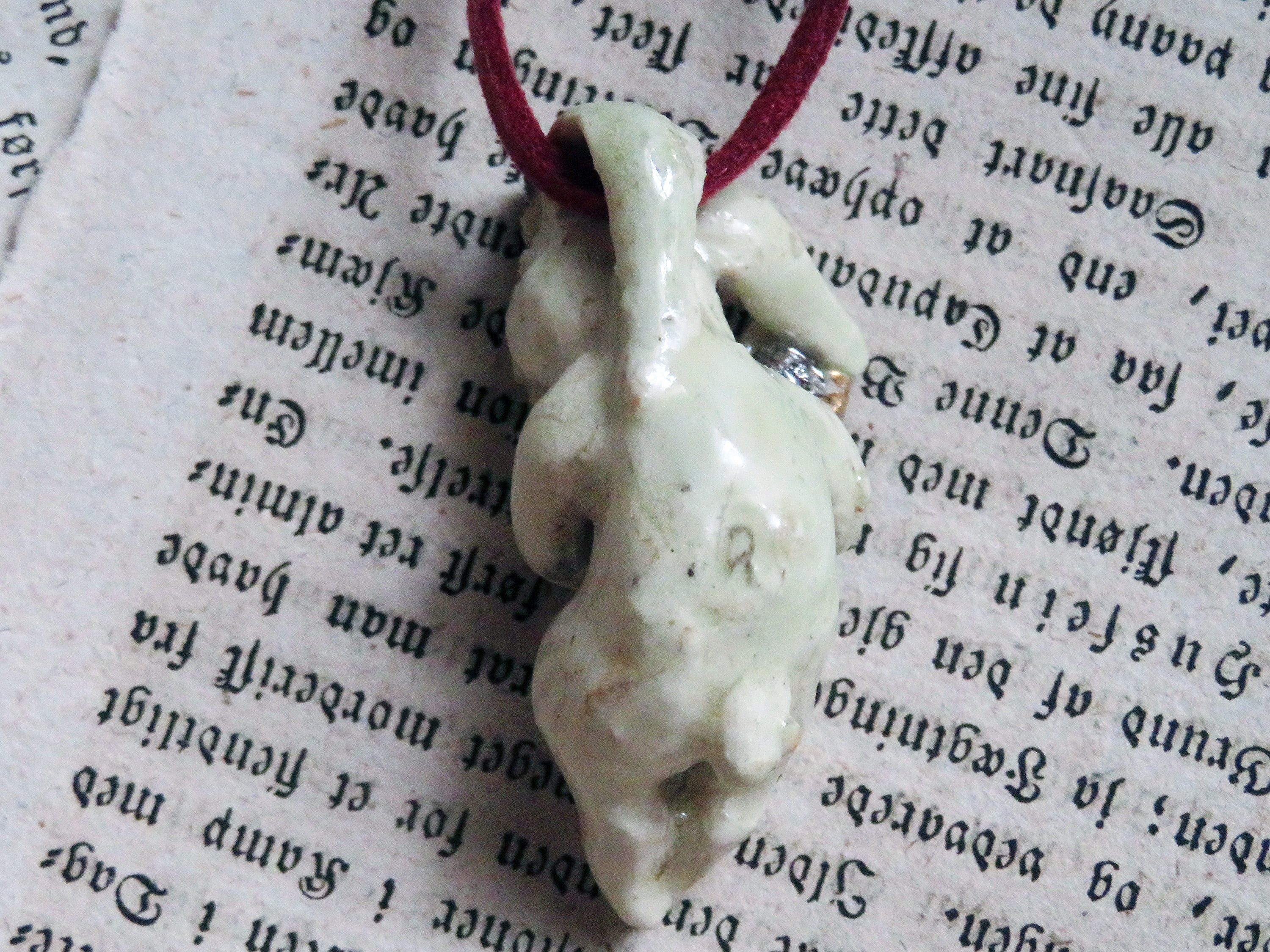耳の部分が通し穴になっているので、ここに革紐などを通しペンダントとして身につけることができます。