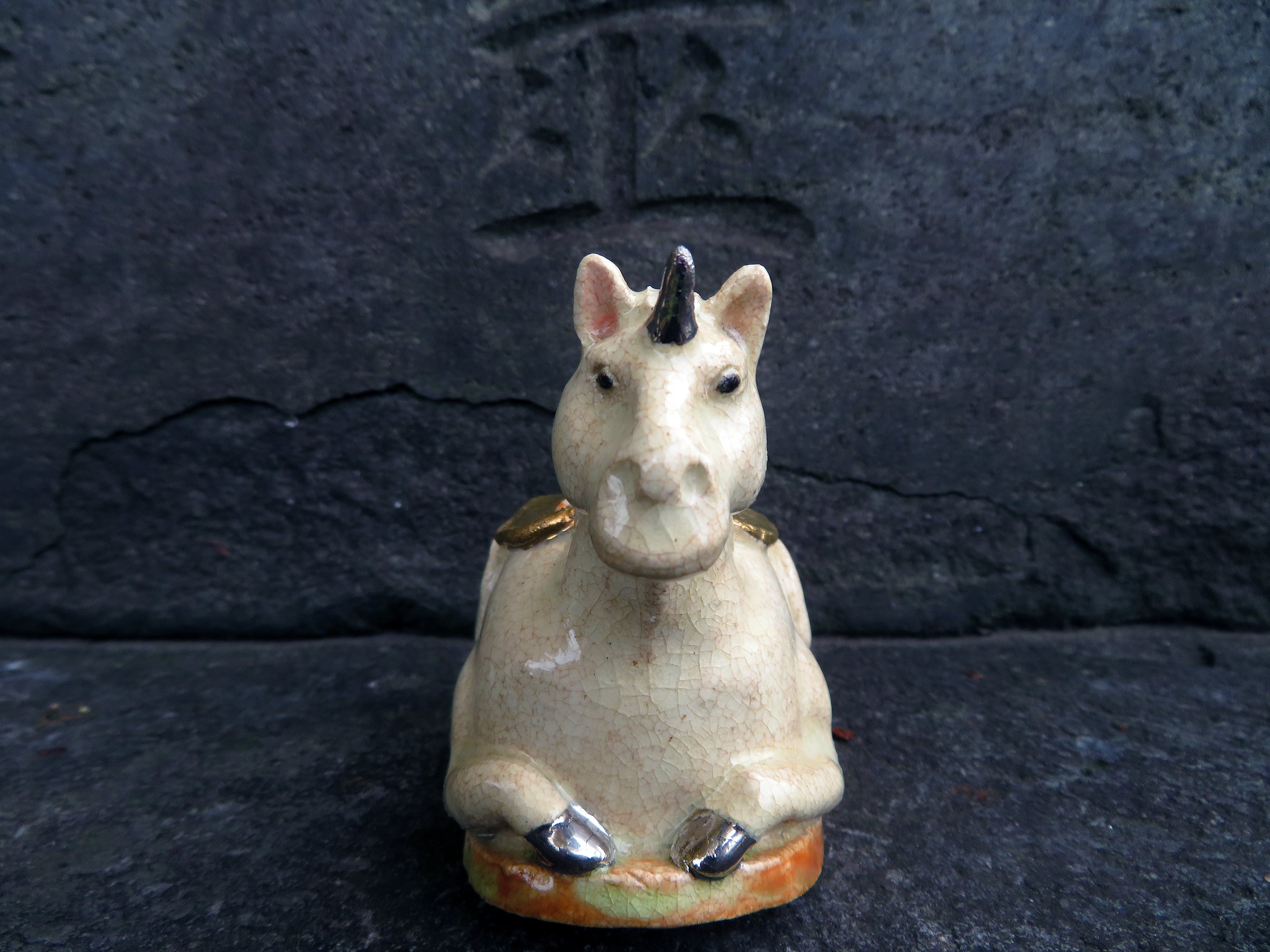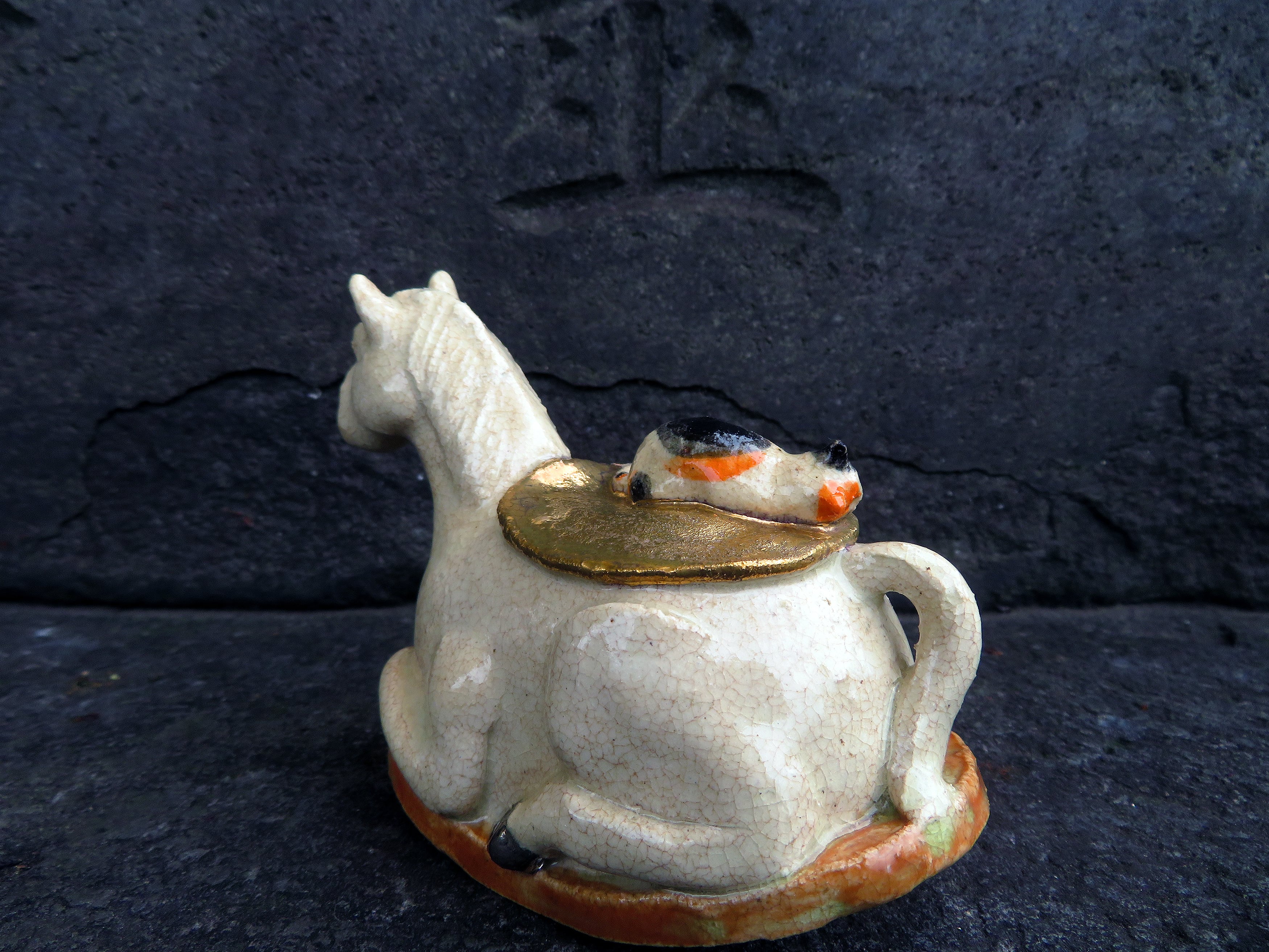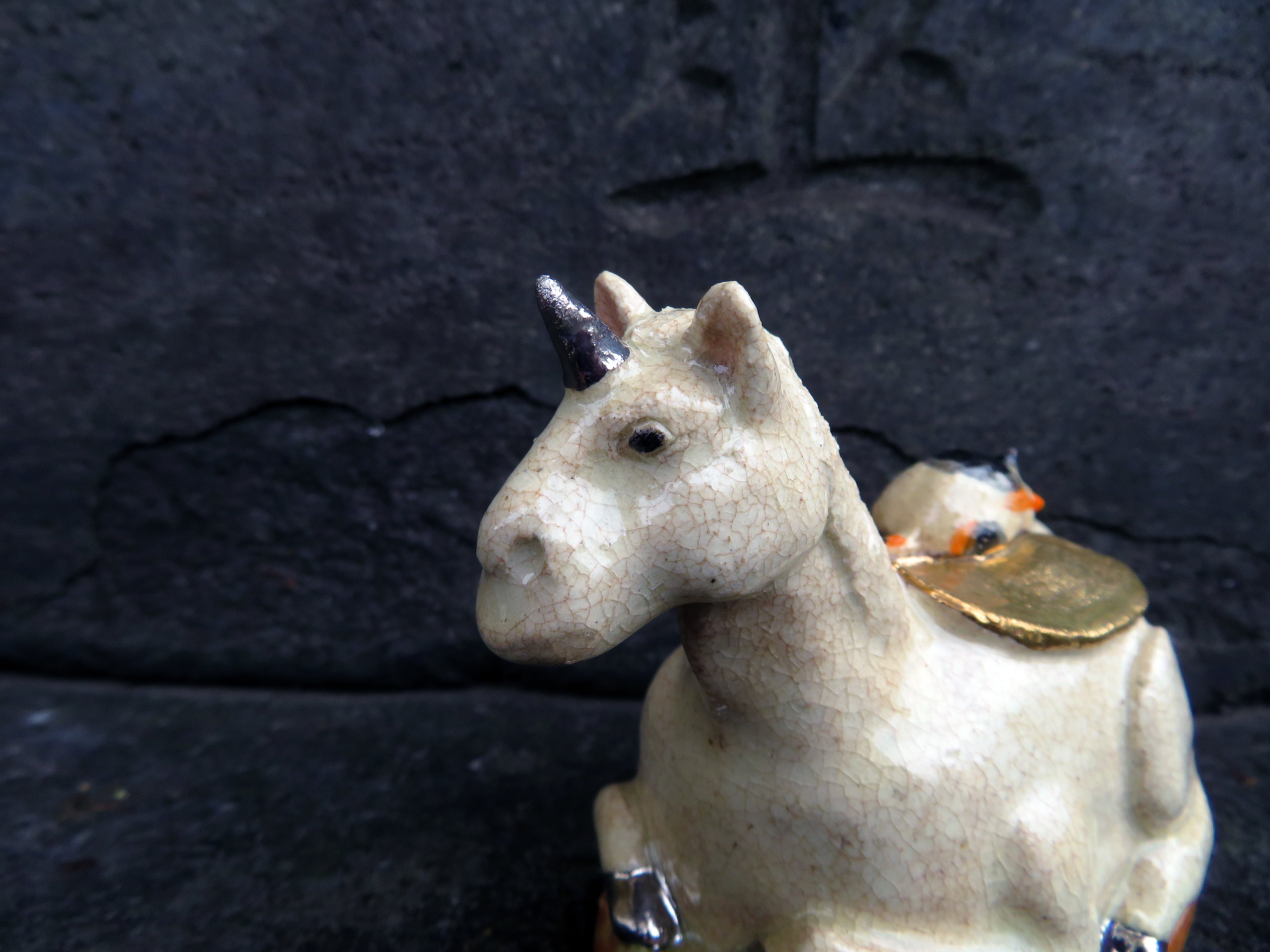 角と蹄にはプラチナ釉、鞍は金釉の仕上げ。