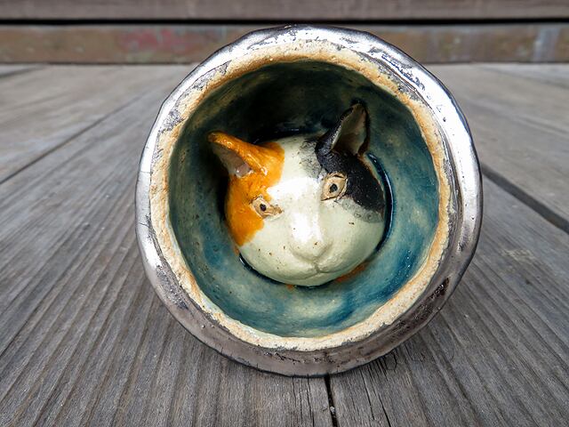この釜の中には三毛猫が隠れている(相場さんの干支作品には猫必須)。