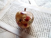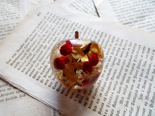 クリアな樹脂に封入されているのは、槙宮さん自作のドライフラワーやアンティークの紙片など。