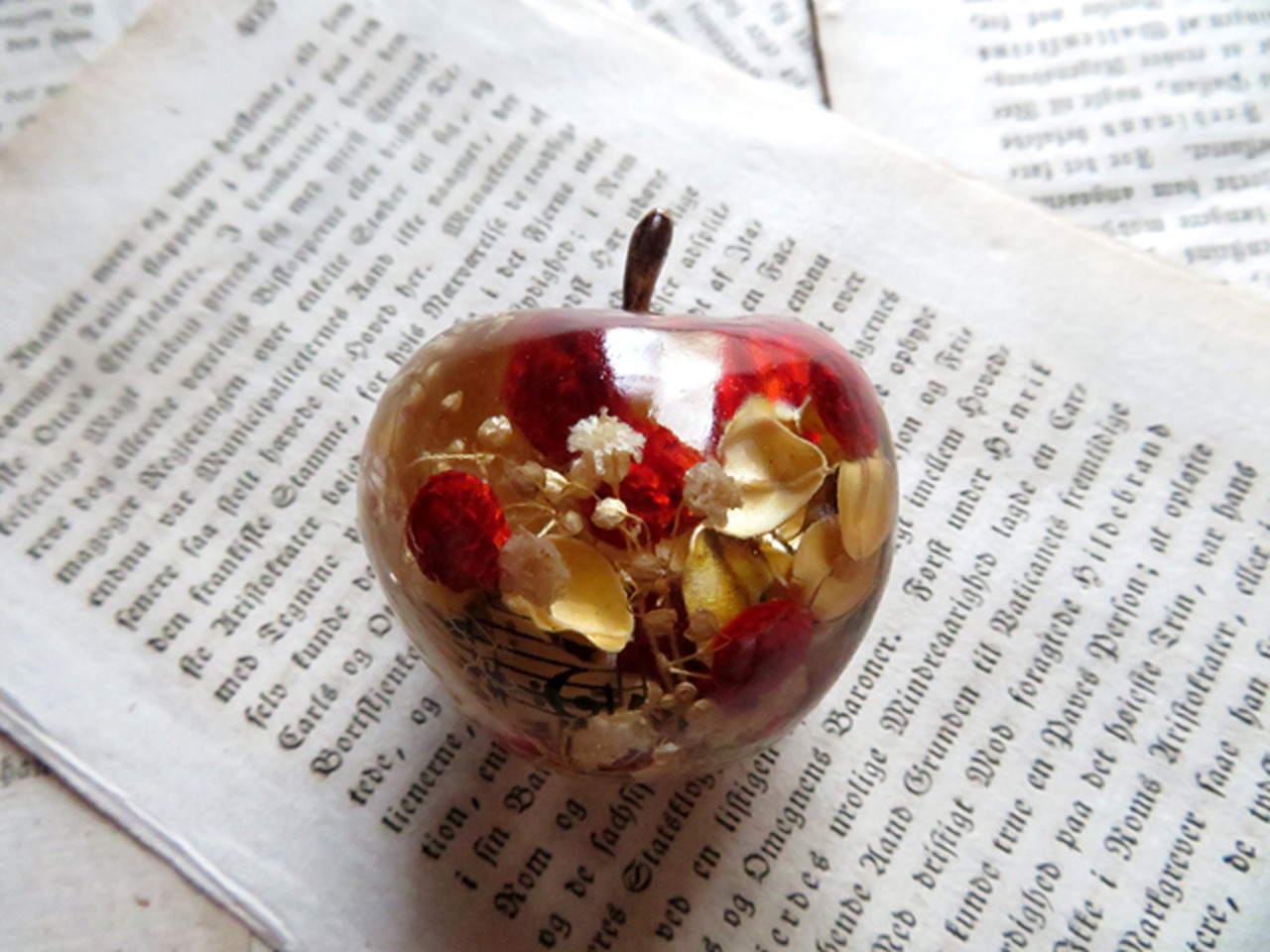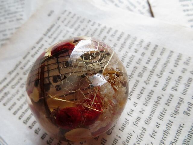クリアな樹脂に封入されているのは、槙宮さん自作のドライフラワーやアンティークの紙片など。