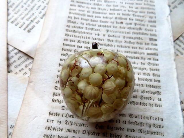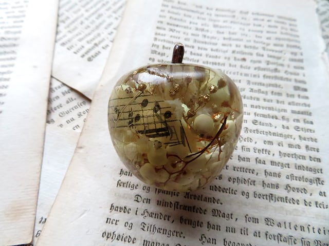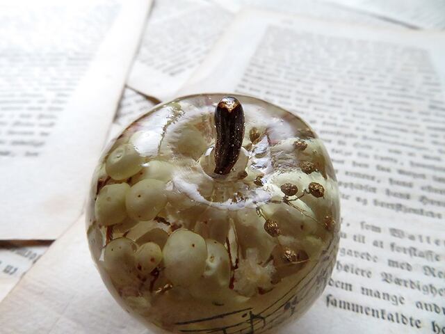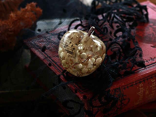 クリアな樹脂に封入されているのはドライフラワーやアンティークの譜面など。