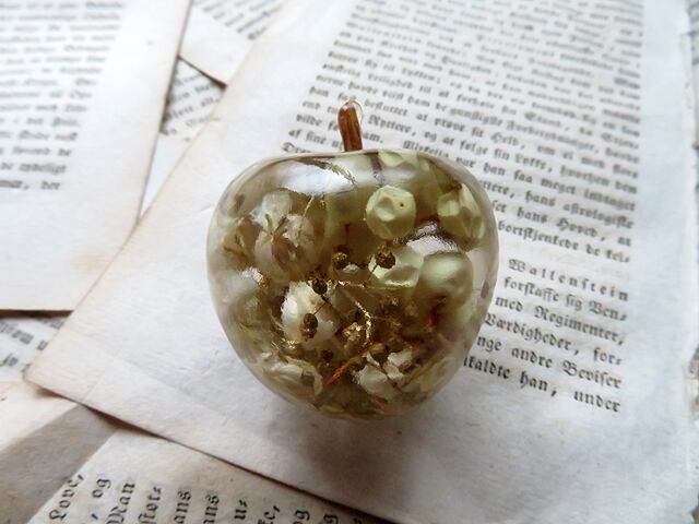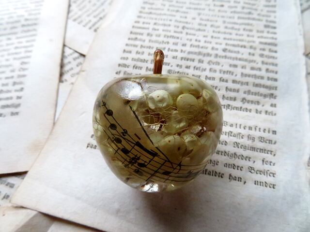 クリアな樹脂に封入されているのはドライフラワーやアンティークの譜面など。