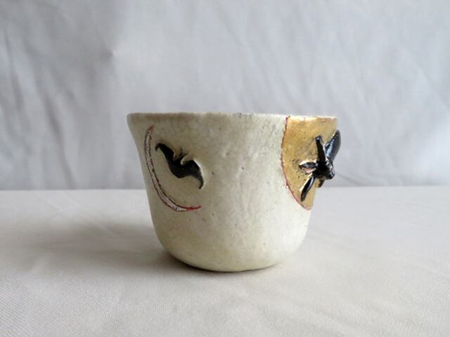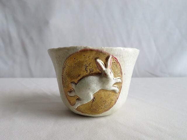 ウサギの背景の月には金釉が、蝙蝠の横の三日月にはプラチナ釉が使われています。