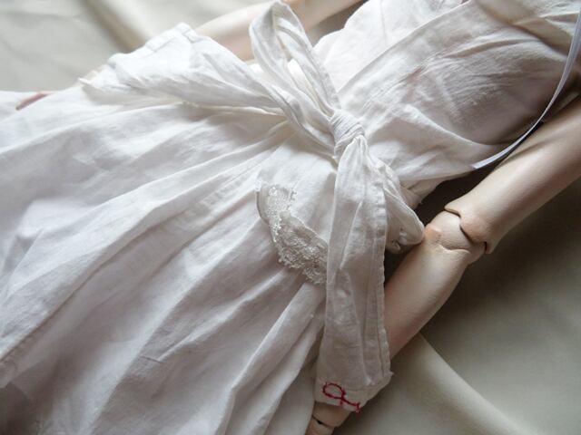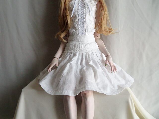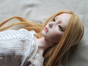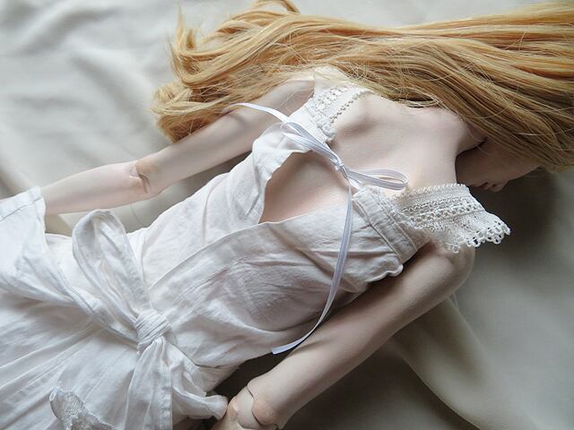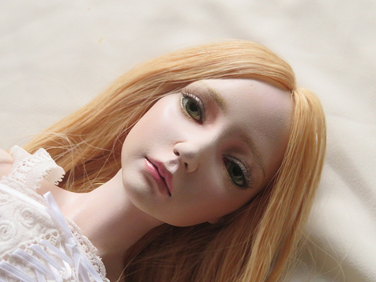 髪はコテを使いカールさせてありますが、これは時間を浴びるとやがて解けてストレートヘアに変化していきます。