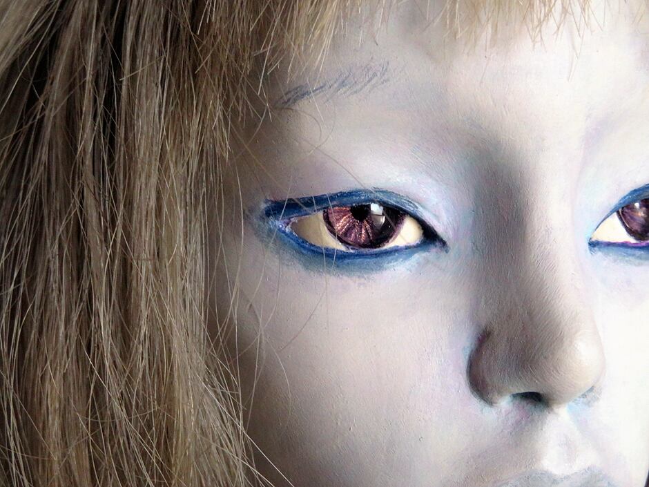 目には江村さん自作の人形義眼が使われており、