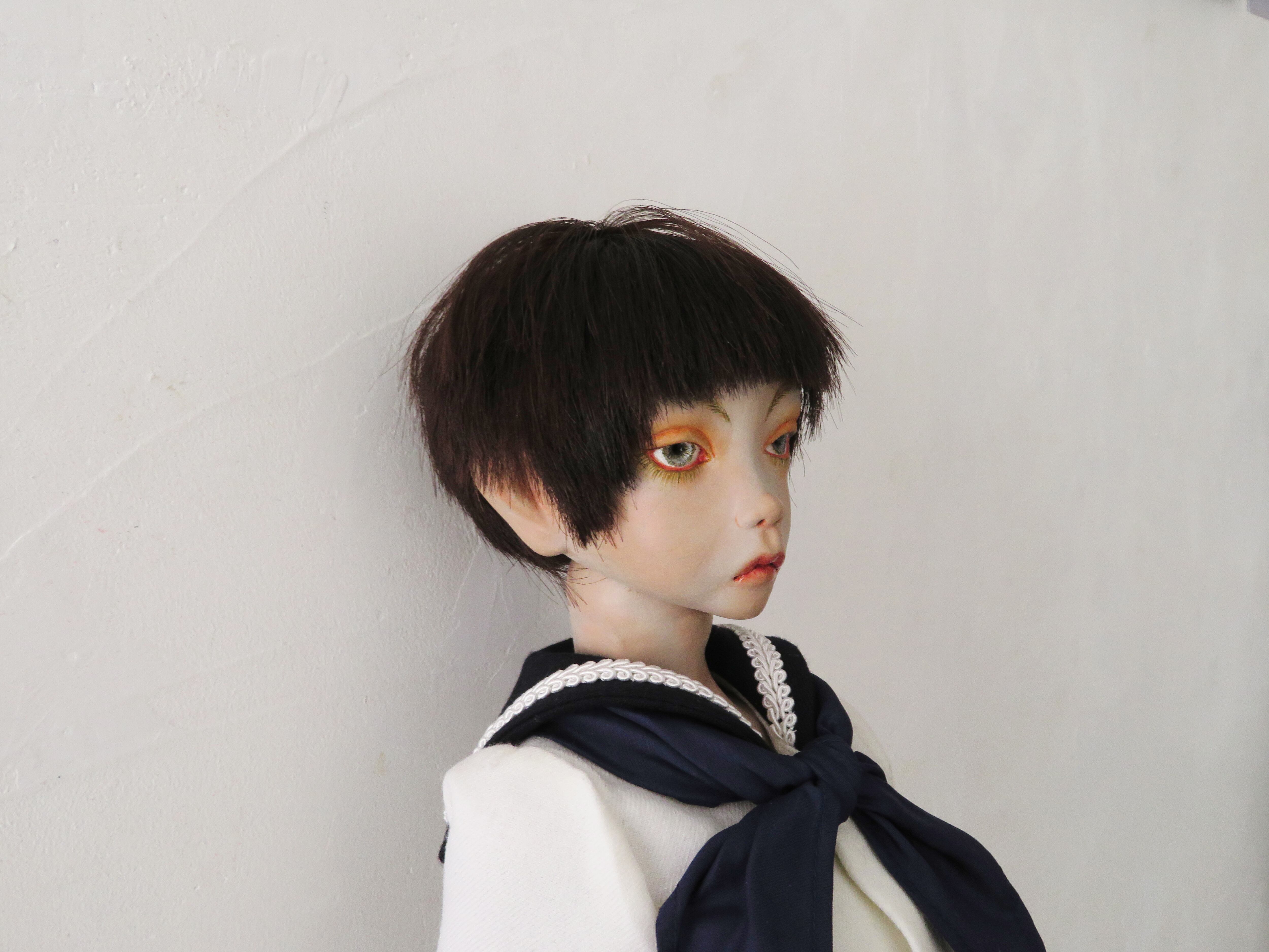 素材/石塑粘土・胡粉・油彩・人毛・インタリオアイ(彫目)