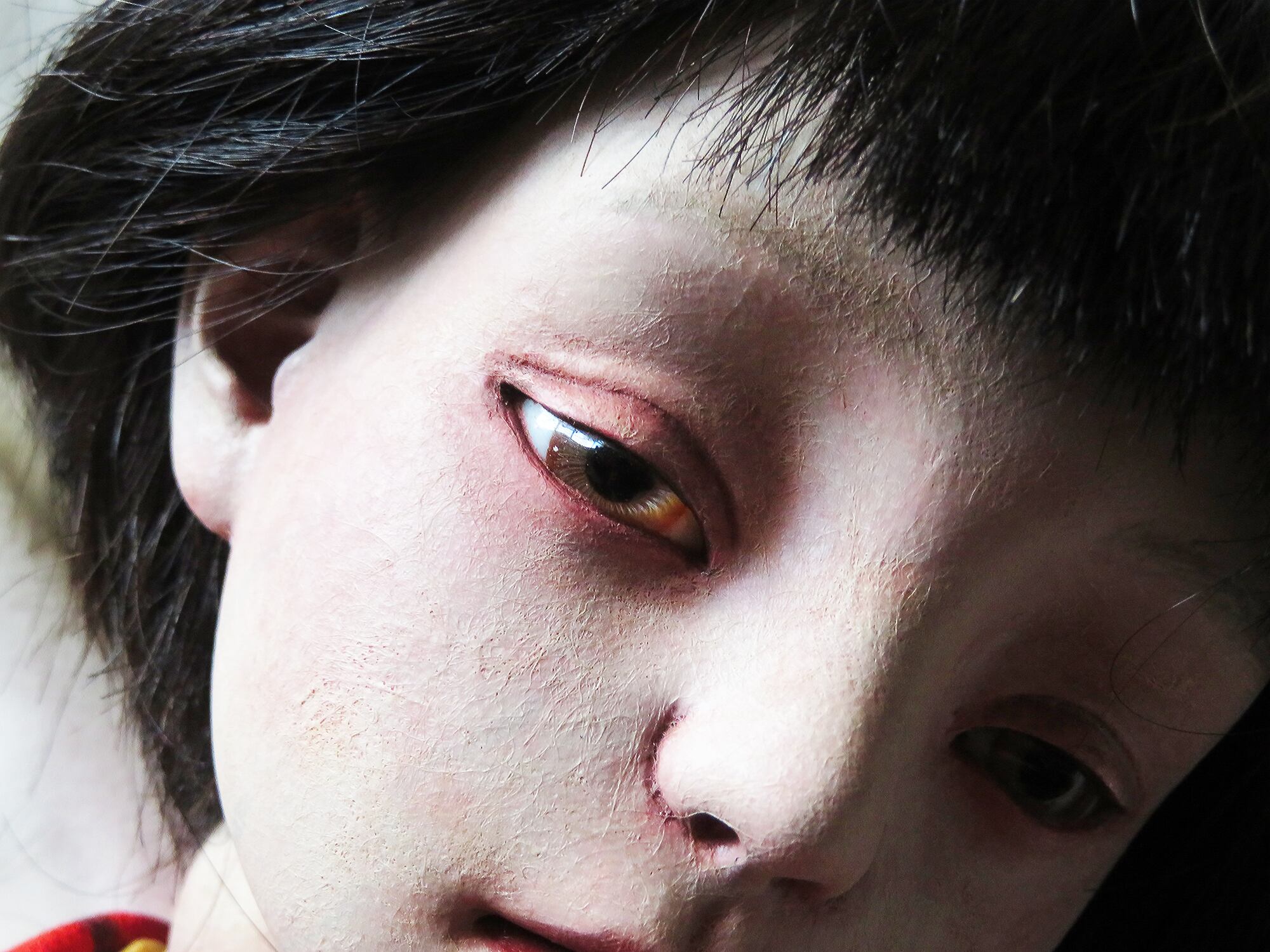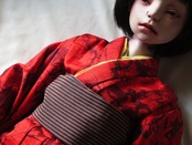 双眸には着物の色に合わせたかのような色合いのグラスアイが使われている。