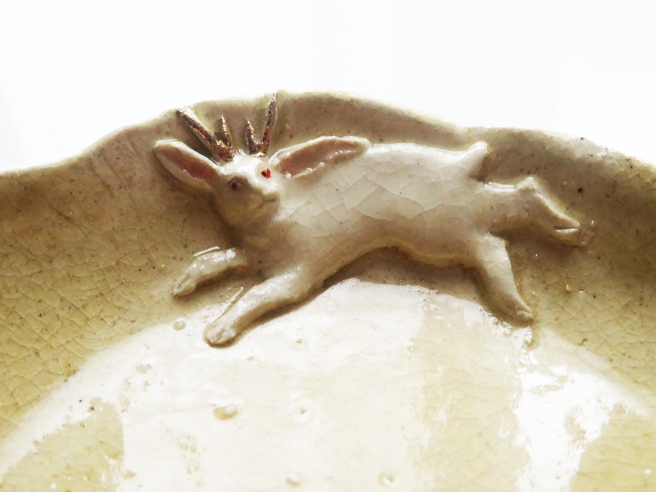 頭部にシカの角が生えているウサギ、ジャッカロープの小皿。